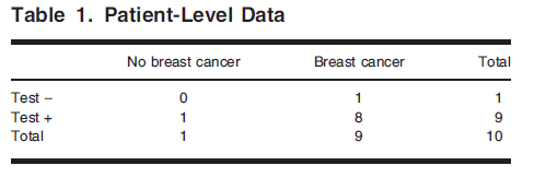 - \[SP = P(Test -| No\ disease) = \frac{P(Test - \& No\ disease)}{P(No\ disease)} = \frac{(0/10)}{(1/10)} = 0%\]