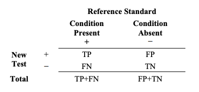 새로운 검사의 진단 정확도(diagnostic accuracy)는 새로운 검사와 참조 표준 결과의 일치 정도를 지칭한다. 우리는 STARD에 정의된 대로 용어 참조 표준을 사용한다. 즉, 참조 표준(reference standard)은 “목표 질환의 유무를 확립하기 위해 사용가능한 최선의 방식이라고 간주되는 것”이다. 이것은 의도된 사용군을 두 개의 군으로만(질환이 있음 또는 없음) 나누며 평가 대상인 새로운 검사의 결과는 고려하지 않는다.