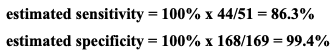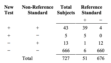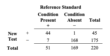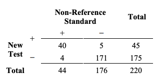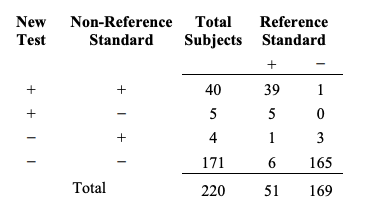 이러한 계산들의 일부 예에서처럼, 이전과 같은 동일한 220명의 대상자들을 고려해보자. 모든 220명이 새로운 검사와 비-참조 표준으로 시험된 후에, 우리는 다음과 같은 결과를 얻는다.