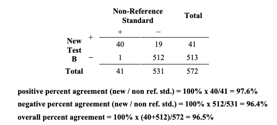 또한 비-참조 표준+(non-reference standard+)이면서 새로운 검사+(New Test+)인 비율을 계산하고 다른 수치를 얻을 수도 있다. 따라서, 양성과 음성 퍼센트 일치도를 계산할 때, FDA는 수행되는 계산을 명백히 명시하록 권장한다.