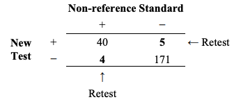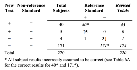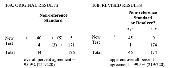 Table 9는 Table 8의 결과가 개정된 결과를 계산하기 위해 부적절하게 어떻게 사용되었는지에 대한 예이다. 구체적으로, 모든 40 새로운 검사+/비-참조 표준+ 대상자들이 부정확하게 참조 표준+로써 계산되었고 모든 171 새로운 검사-/비-참조 표준- 대상자들은 참조 표준-로써 부정확하게 계산되었다. 다음에, 5건의 새로운 검사+/비-참조 표준-/참조 표준+ 대상자들이 새로운 검사+/비참조 표준+로 이동되었고 3건의 새로운 검사-/비-참조 표준+/참조 표준- 대상자들이 새로운 검사-/비-참조 표준-로 이동되었다. 1건의 새로운 검사-/비-참조 표준+/참조 표준+는 새로운 검사-/비-참조 표준+에 머무른다.