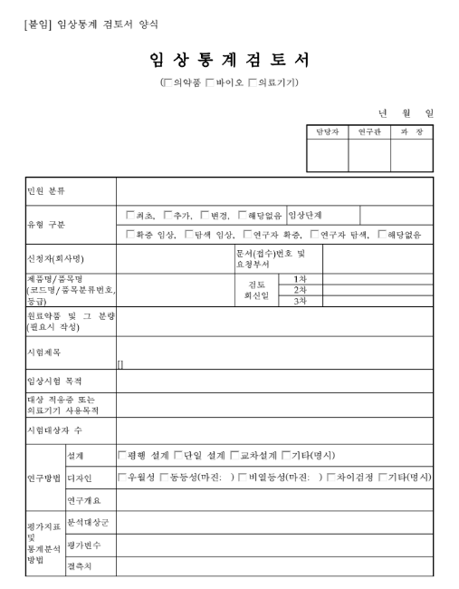 - 귀무가설과 대립가설 등 임상적 주장을 기술하였는가?