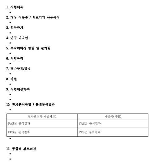- 모든 분석 대상자(FAS) 분석 및 계획서 순응 임상시험대상자군(PP) 분석 대상이 된 시험대상자들과 제외된 시험대상자들에 대해 기술되어 있는가?