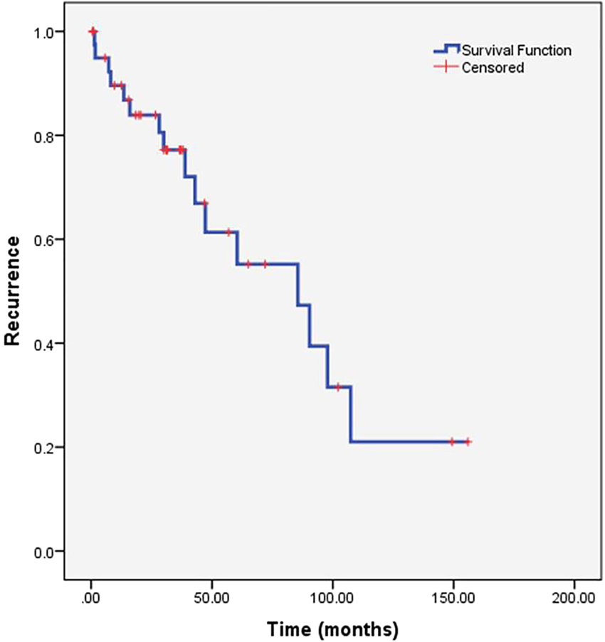 그러면 위에서 언급한 이혼률은 어떻게 생각해볼 수 있을까요? 결혼 시점으로부터 이혼할 때까지의 기간이 모두 다르기 때문에, 결혼 후 1년 이혼률, 3년 이혼률, 5년 이혼률 등을 생각해볼 수 있겠지요. 전체 결혼 기간에 대해서 중도절단과 event 발생까지 고려한 Kaplan-Meier plot을 그려볼 수 있습니다. 생존 기간에 따른 이혼 발생을 한 눈에 확인할 수 있는 curve입니다. 이때 생존률은 추정 공식을 활용하여 계산합니다. 관심 있으신 분들은 Kaplan-Meier estimator를 확인해보시면 됩니다. Kaplan-Meier estimator를 활용하여 결혼 후 1년 이혼률, 3년 이혼률, 5년 이혼률을 추정해볼 수 있습니다. 아래 그림이 Kaplan-Meier plot 예시입니다.