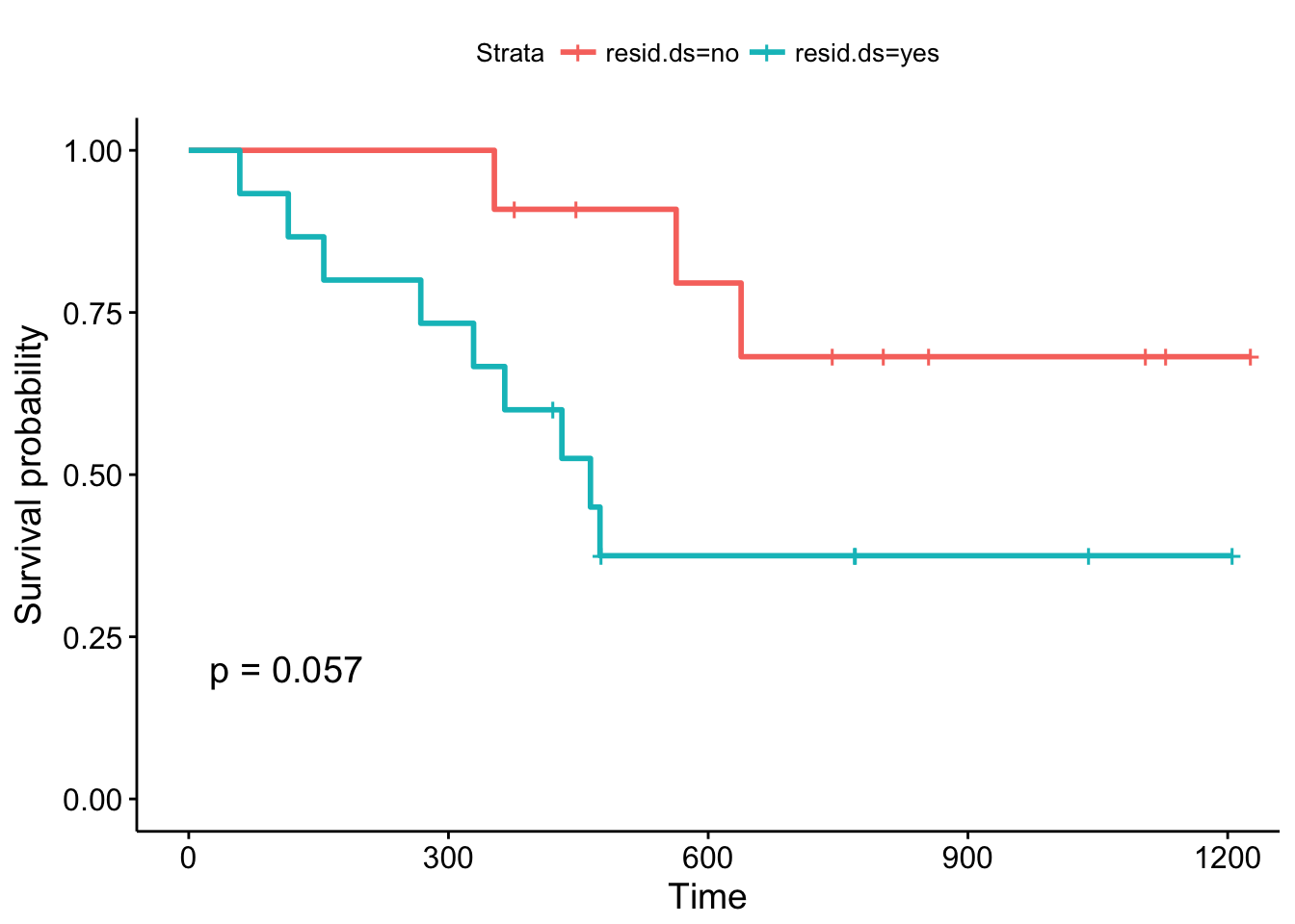 여기서 더 나아가 한국인 부부와 한국인과 외국인 부부의 생존 곡선을 비교하고 싶을 때에도 Kaplan-Meier plot을 그려볼 수 있습니다. 다음과 같이 두 생존 곡선을 한 눈에 확인할 수 있습니다.